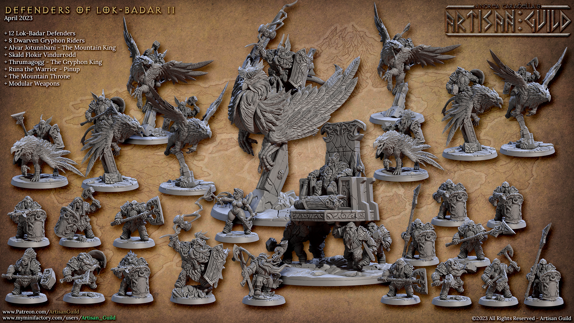 Defenders of Lok-Badar II Set ist eine Kreation von Artisan Guild und nutzbar für Tabletop, DnD oder andere RPGs. Man kann das komplette Set oder einzelne Miniaturen auswählen. Die Miniaturen werden im Maßstab 32mm geliefert.