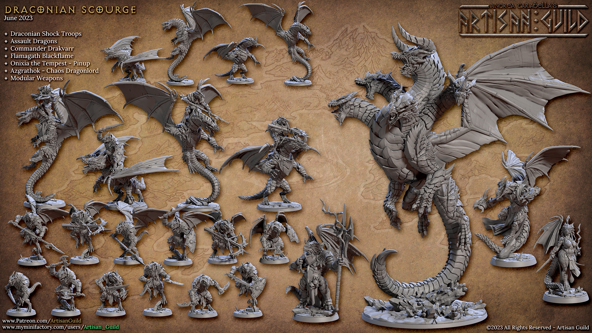 Draconian Scourge Set ist eine Kreation von Artisan Guild und nutzbar für Tabletop, DnD oder andere RPGs. Man kann das komplette Set oder einzelne Miniaturen auswählen. Die Miniaturen werden im Maßstab 32mm geliefert.