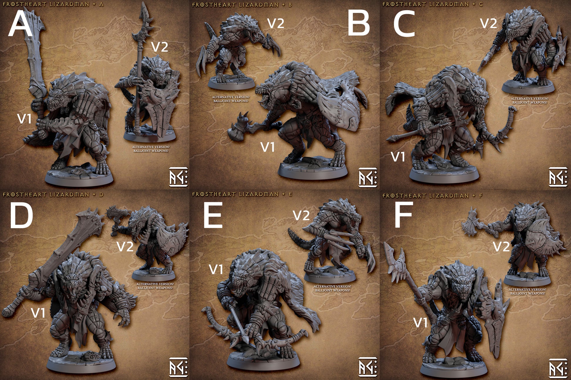Frostheart Lizardmen Set ist eine Kreation von Artisan Guild und nutzbar für Tabletop, DnD oder andere RPGs. Man kann das komplette Set oder einzelne Miniaturen auswählen. Die Miniaturen werden im Maßstab 32mm geliefert.