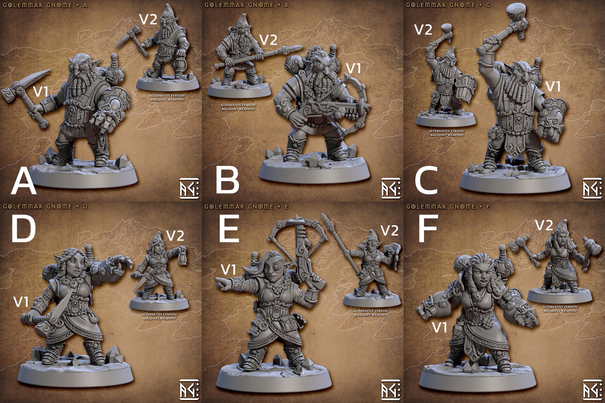 Gnomes of Golemmar Set ist eine Kreation von Artisan Guild und nutzbar für Tabletop, DnD oder andere RPGs. Man kann das komplette Set oder einzelne Miniaturen auswählen. Die Miniaturen werden im Maßstab 32mm geliefert.