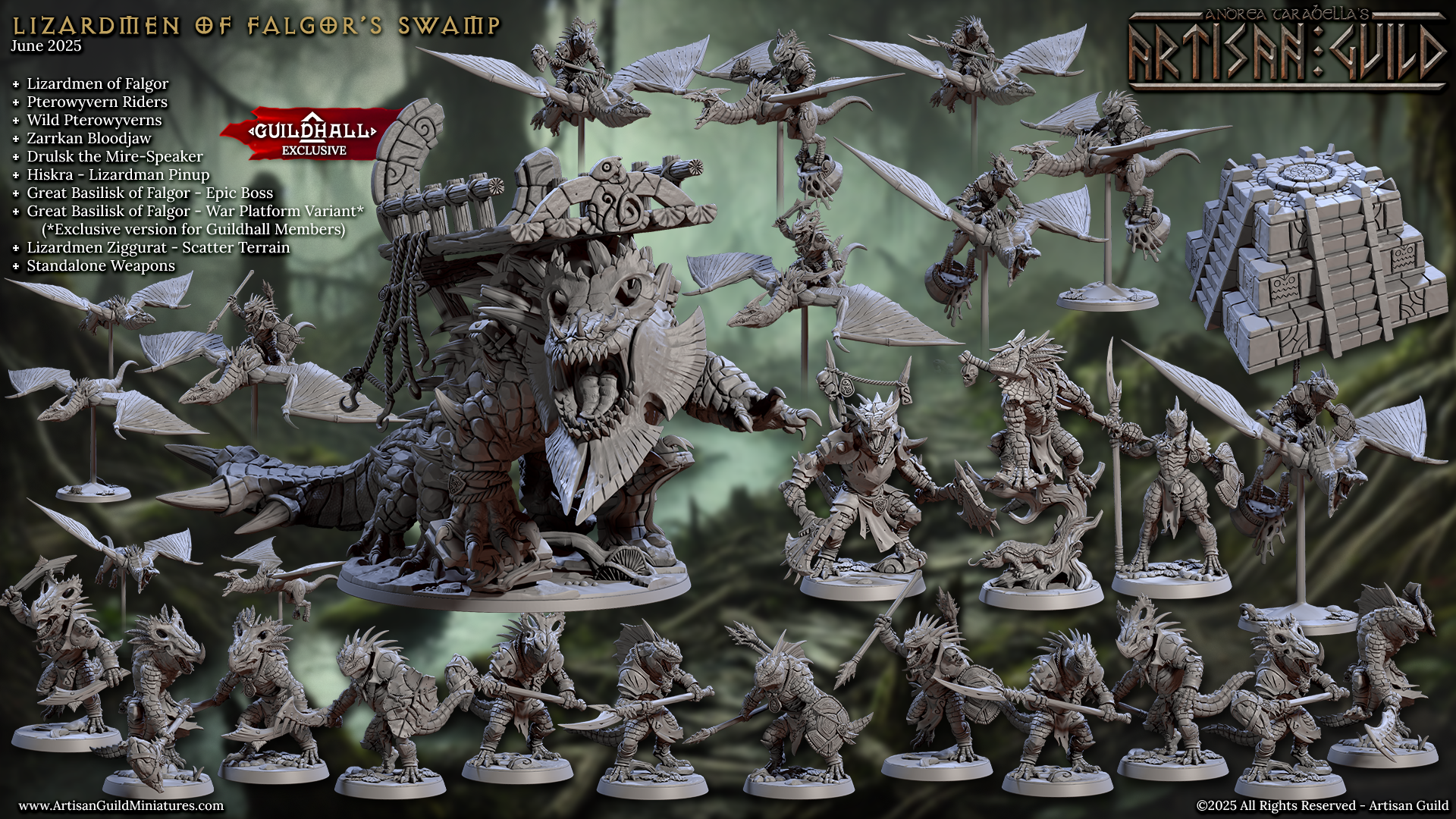 Lizardmen of Falgor's Swamp Set ist eine Kreation von Artisan Guild und nutzbar für Tabletop, DnD oder andere RPGs. Man kann das komplette Set oder einzelne Miniaturen auswählen. Die Miniaturen werden im Maßstab 32mm geliefert.