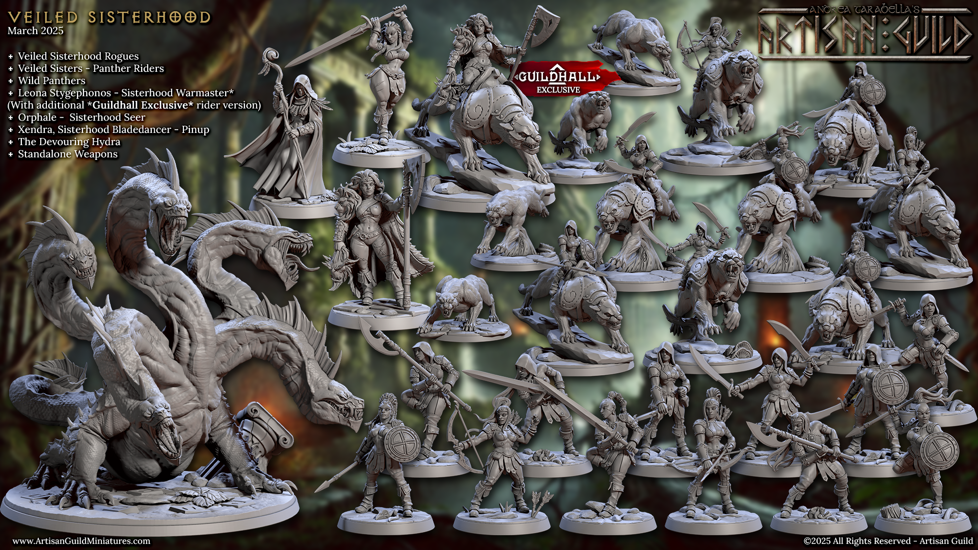 Veiled Sisterhood Set ist eine Kreation von Artisan Guild und nutzbar für Tabletop, DnD oder andere RPGs. Man kann das komplette Set oder einzelne Miniaturen auswählen. Die Miniaturen werden im Maßstab 32mm geliefert.